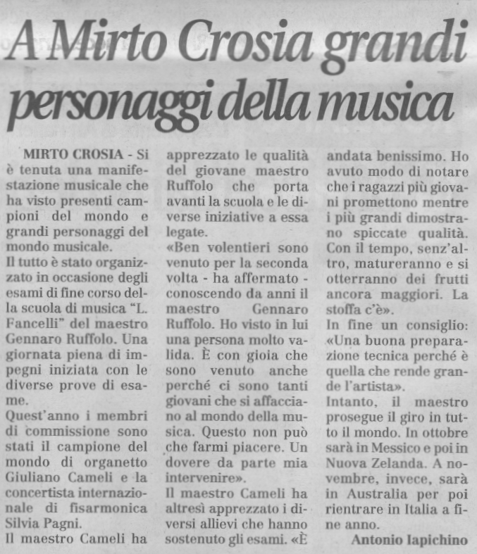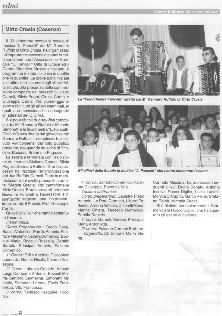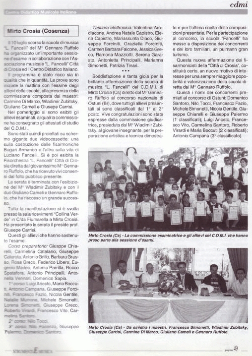 Il M° Ruffolo con la commissione che ha esaminato gli allievi della scuola Luciano Fancelli nel Giugno 2002 e poi tra gli allievi, in due foto riportate su Strumenti e Musica.